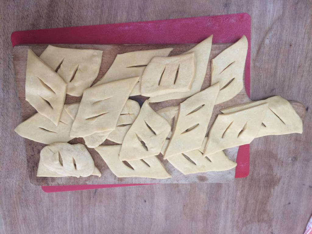 With a rolling pin, roll out the dough till it is about 1 cm thick. Cut triangle shapes out of it and slice each shape twice in the middle, with the end of a sharp knife.