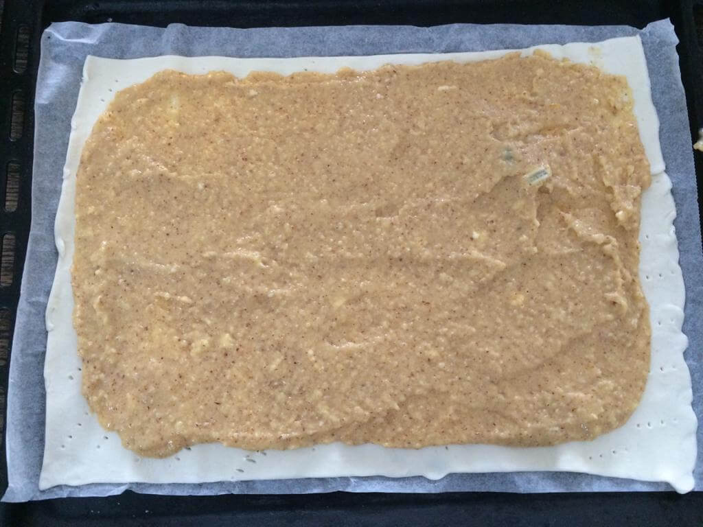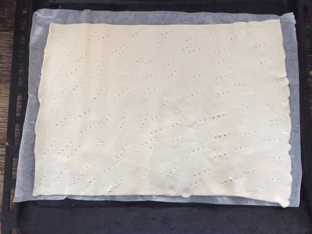 Put one of puff pastry dough on a tray lined with baking paper, and prick it with a fork.