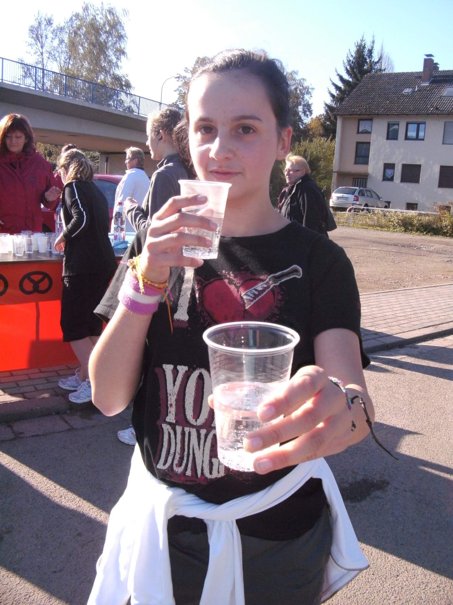 La plupart des gens partent en groupe, certains préfèrent courir seuls. Nous avons de la chance: le temps est frais mais il fait beau. C´est le temps idéal pour courir. Au fur et à mesure que nous progressons, nous remarquons qu´il y a de moins en moins de coureurs. Au bout de 7,5km la piste est presque déserte ! A cette étape, nous sommes finalement récompensés: il y a un stand où nous attendent des bananes, des barres chocolatées et, bien entendu, aussi de l´eau. Puis c´est reparti pour 7,5km !
