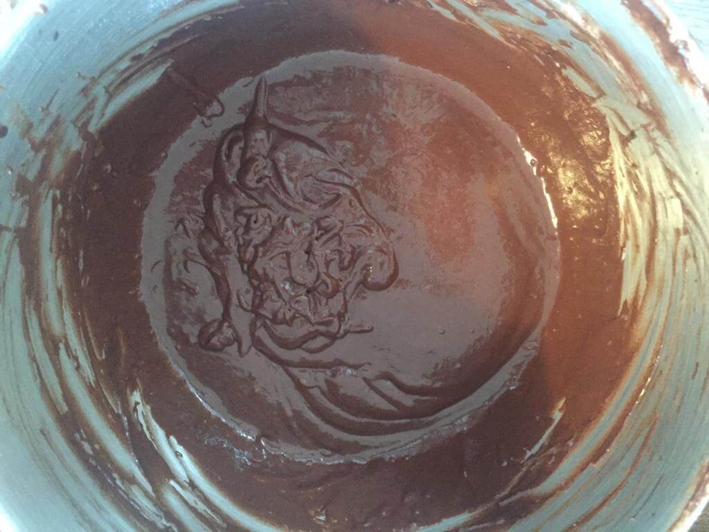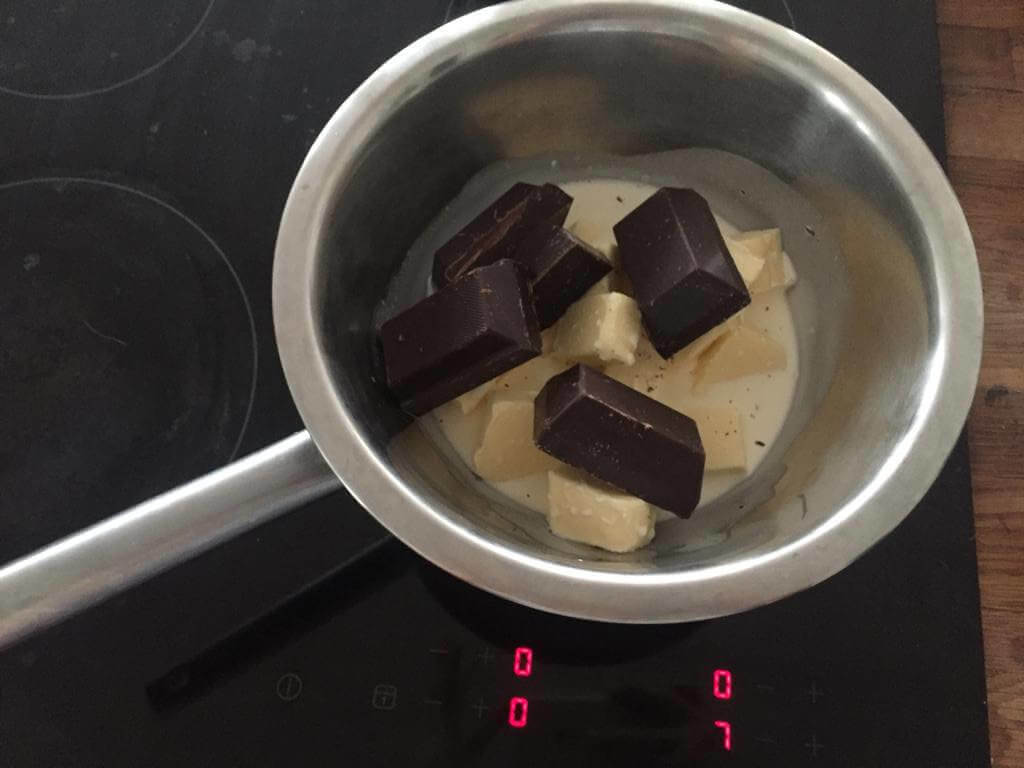Start with the frosting: melt the chocolate, the butter, the cream and the salt together in a bain-marie (a water bath) until you get a smooth texture. Then, let the frosting cool down.